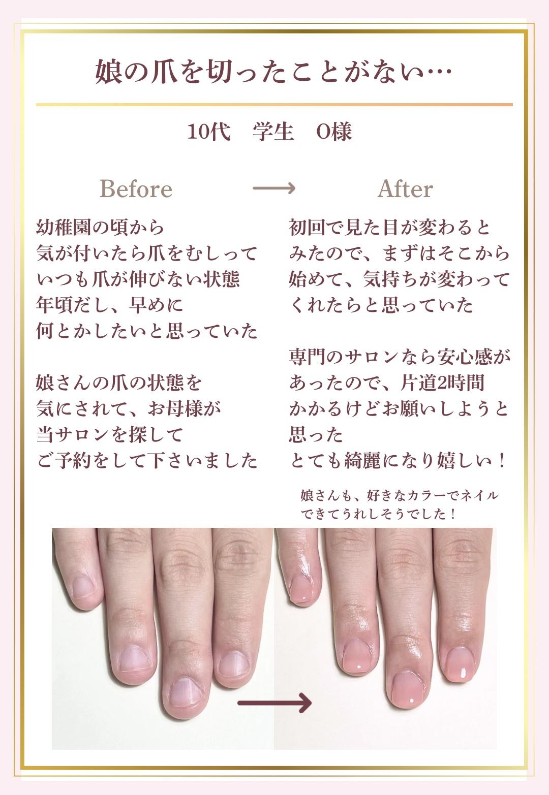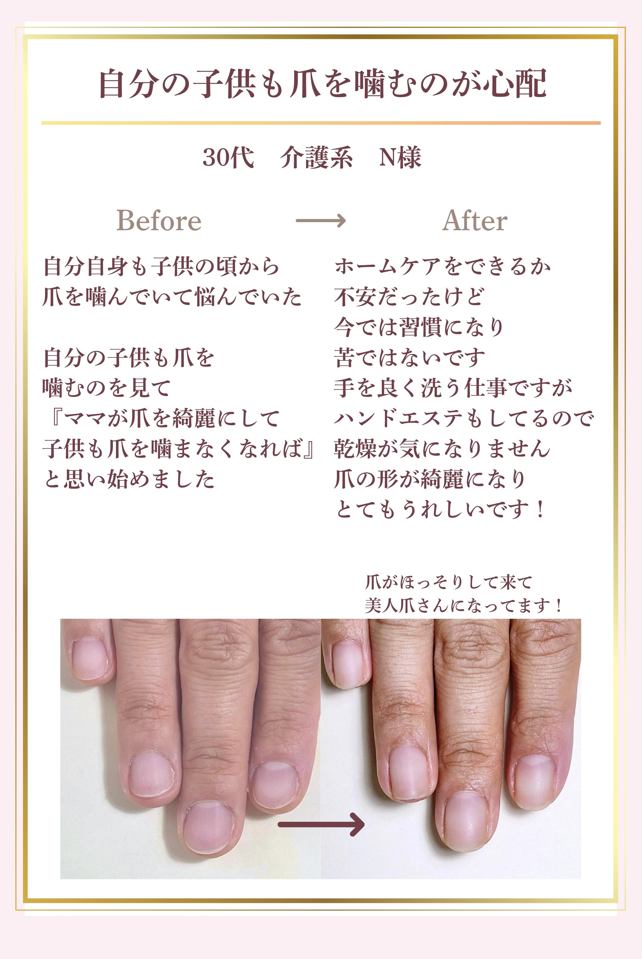 私の子供の頃からのこの経験で、ネイルを始めて爪の形は変わる!爪は綺麗になれる!を体験してきたからこそ、爪にお悩みのある方に、指先から綺麗になって自信を持ってほしいと願っています