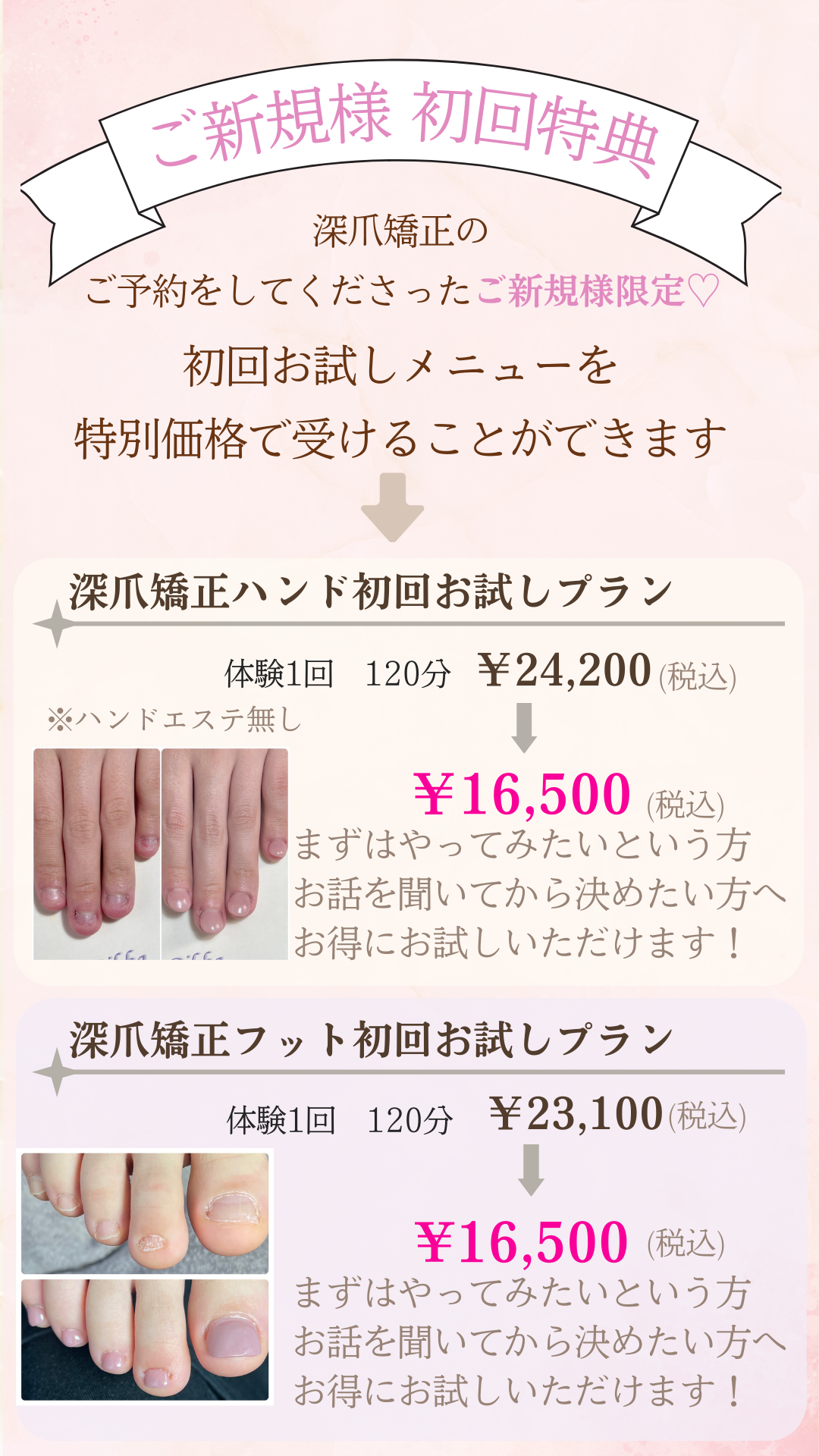 LINEを登録後、お名前とご相談内容や、お爪のお写真をお送りください。 ご予約をされる際はLINEメニューにある『ご予約はこちら』から「モニター価格」を選択しご予約できます。 (※時間に限りがありますので、お早目のご予約をおすすめしております。) |